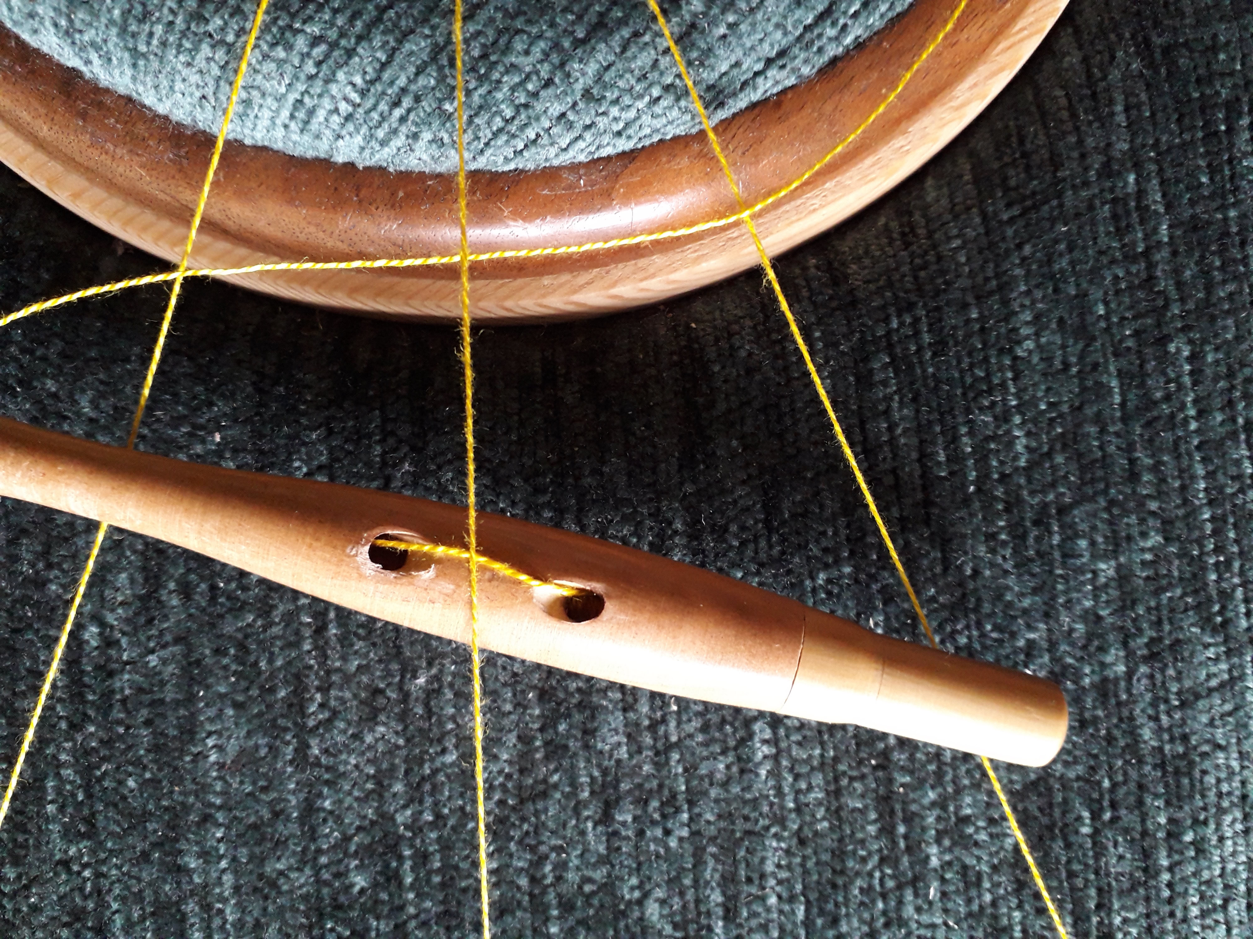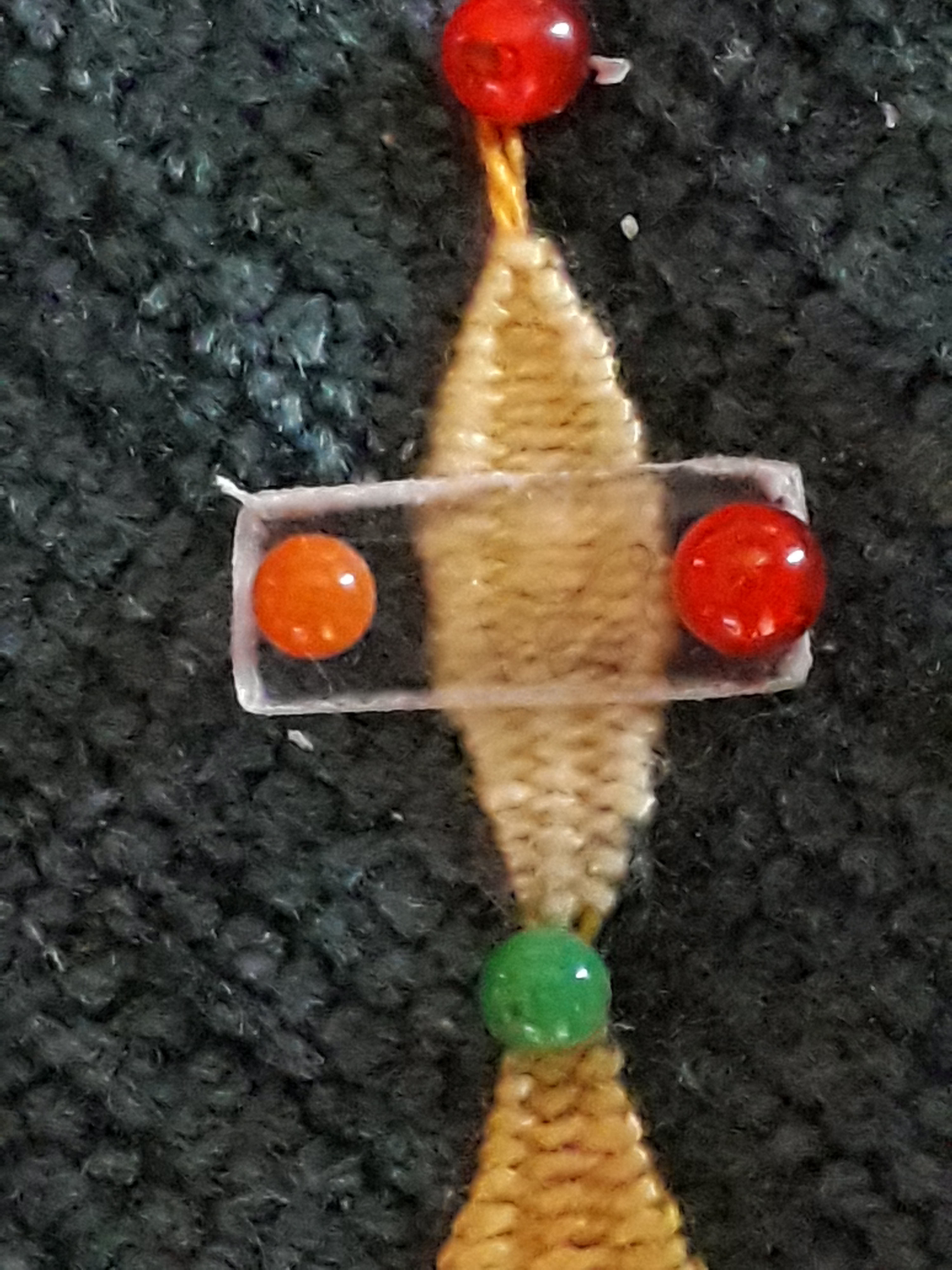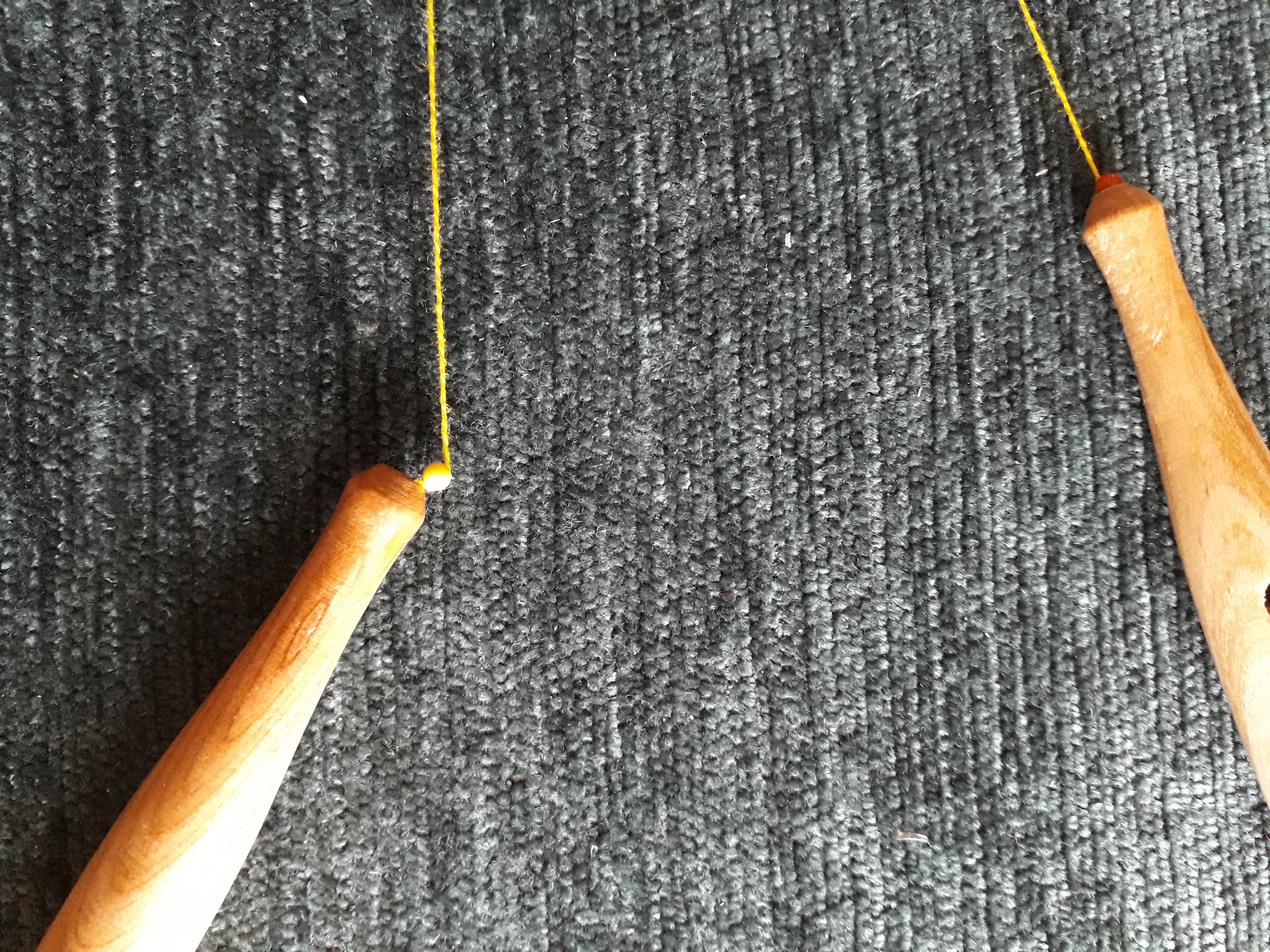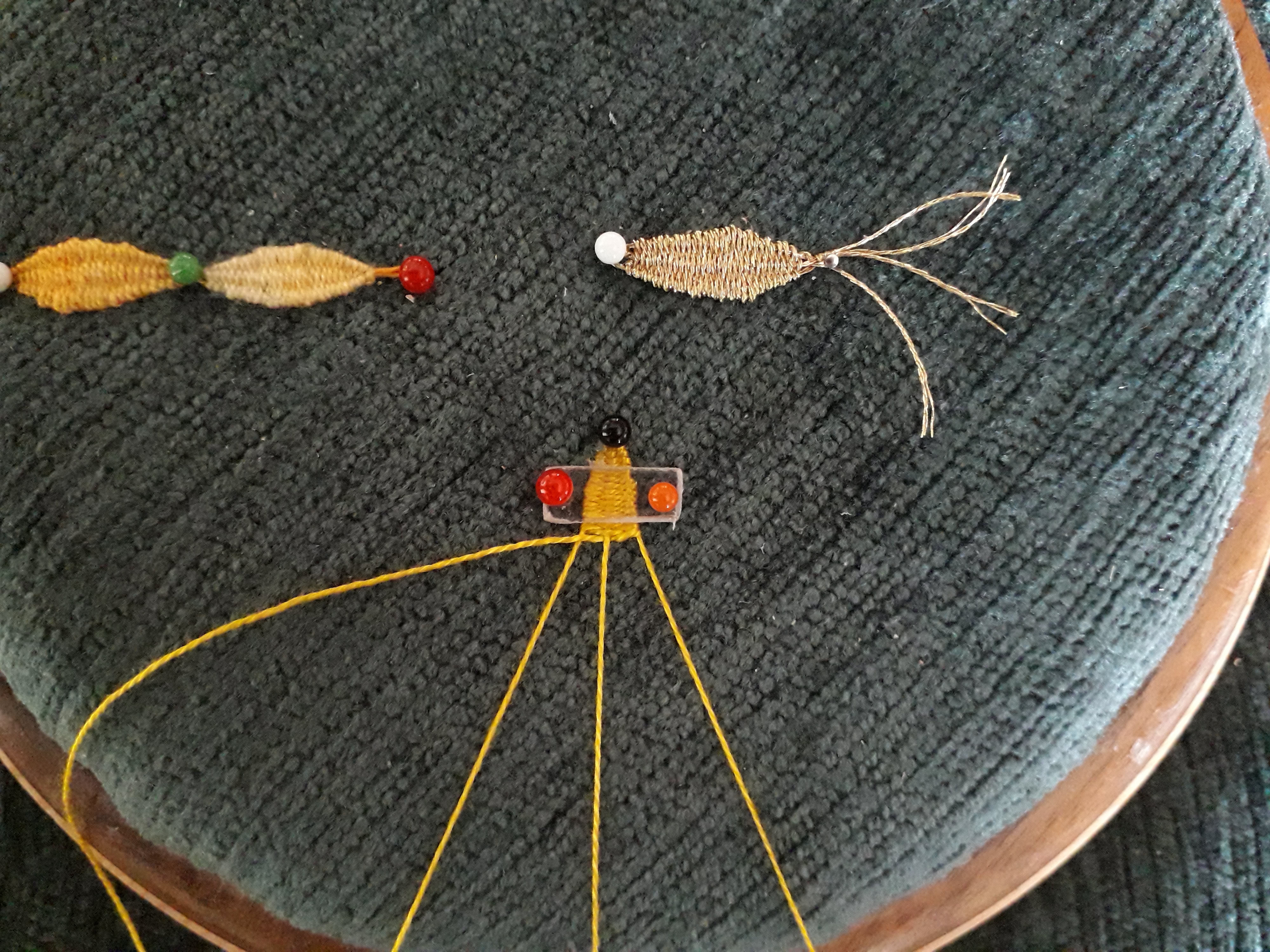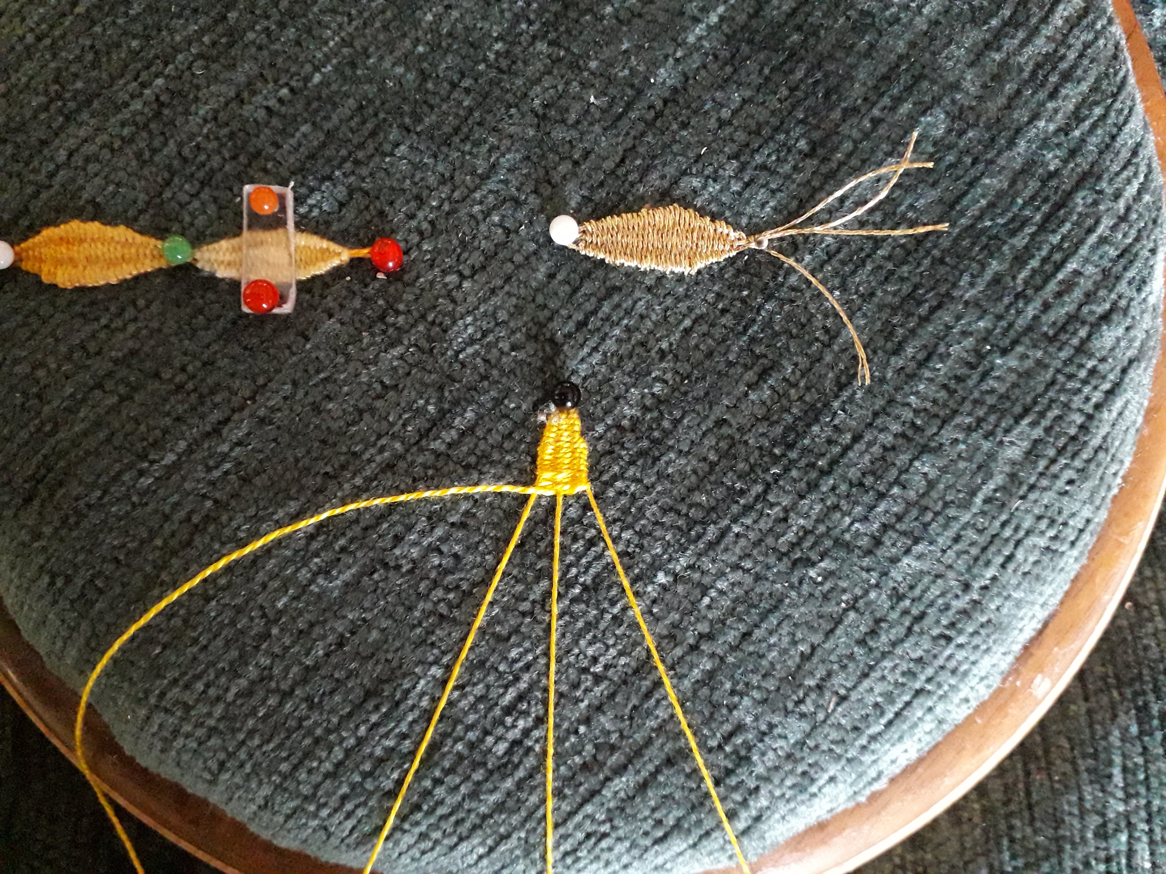 Le 4 iéme fuseau est prêt pour tisser le point d’ esprit en zigzaguant de gauche à droite entre les 3 fuseaux selon le principe du tissage autour du fuseau central.