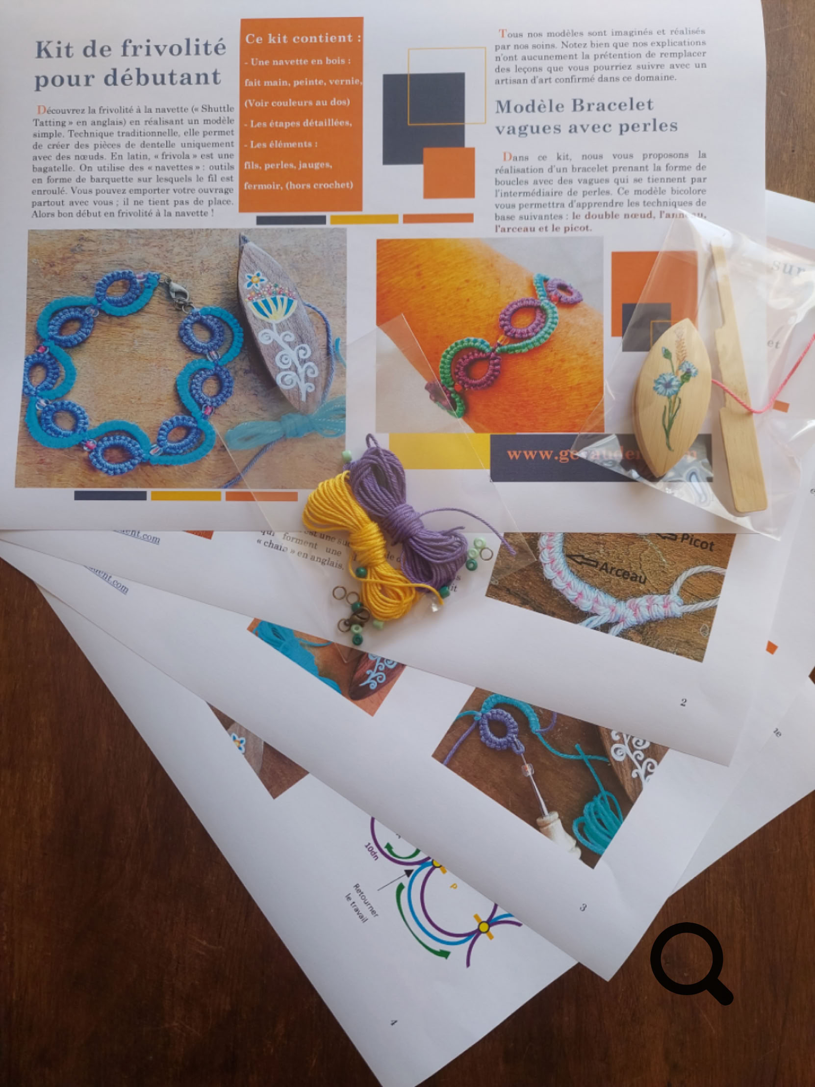 Découvrez la frivolité à la navette (« Shuttle Tatting » en anglais) en réalisant un modèle simple. Technique traditionnelle, elle permet de créer des pièces de dentelle uniquement avec des nœuds. En latin, « frivola » est une bagatelle. On utilise des « navettes » : outils en forme de barquette sur lesquels le fil est enroulé. Vous pouvez emporter votre ouvrage partout avec vous ; il ne tient pas de place. Alors bon début en frivolité à la navette !