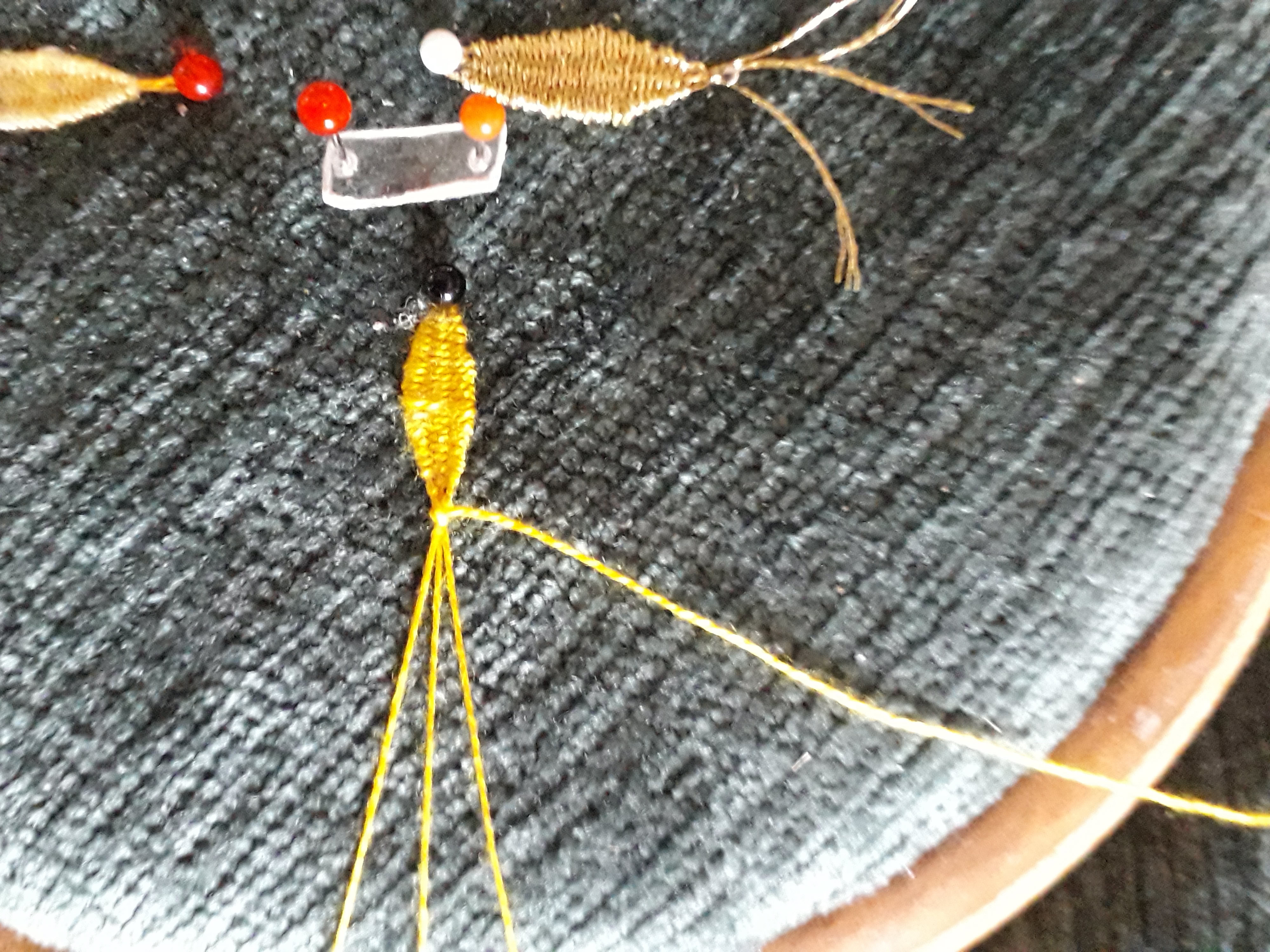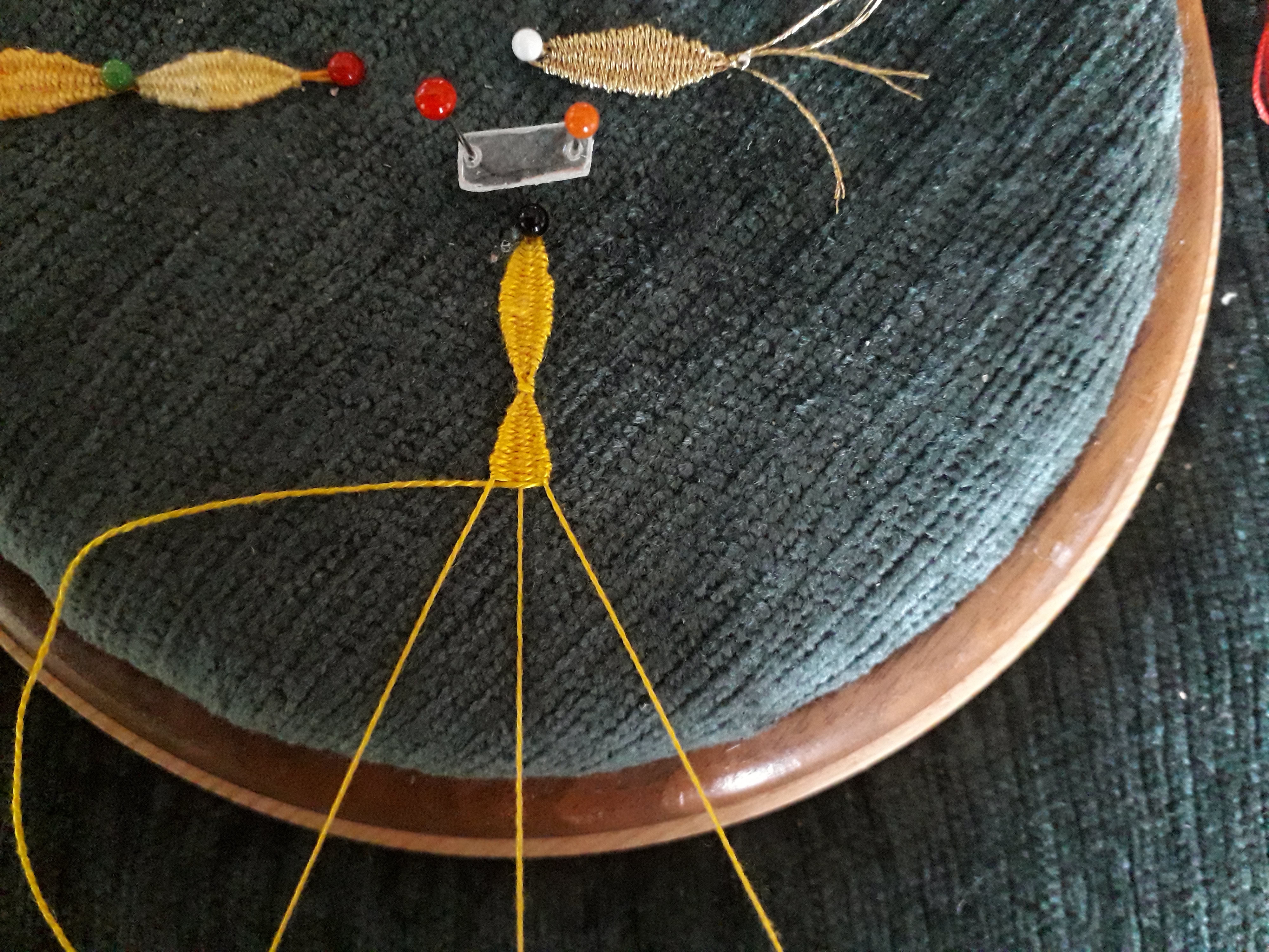 Le 4 iéme fuseau est prêt pour tisser le point d’ esprit en zigzaguant de gauche à droite entre les 3 fuseaux selon le principe du tissage autour du fuseau central.