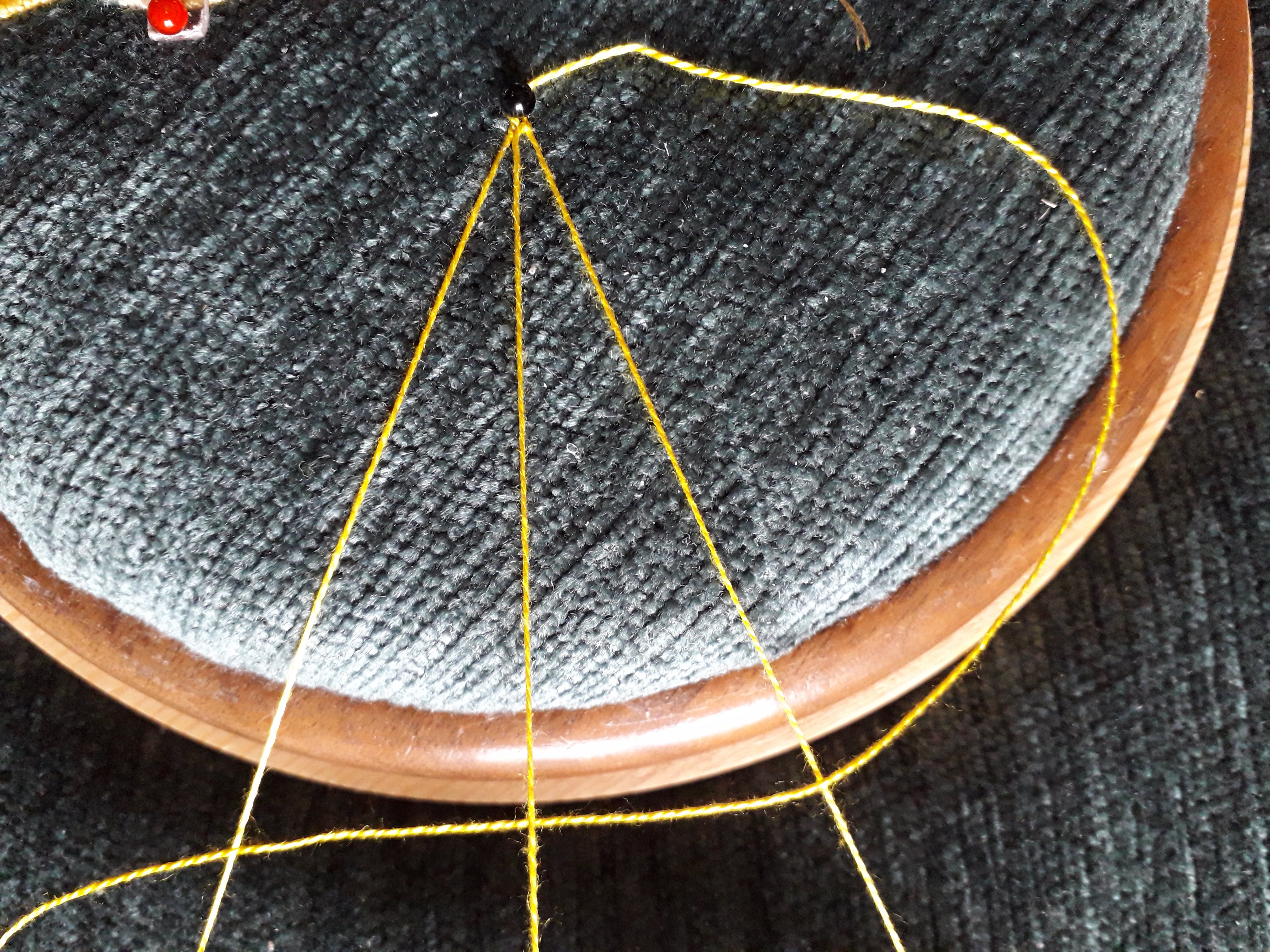 Enfoncez 3 épingles à tête de verre à 15 ou 20 cm de l’ épingle de départ suivant un angle qui déterminera celui de votre point d’ esprit.