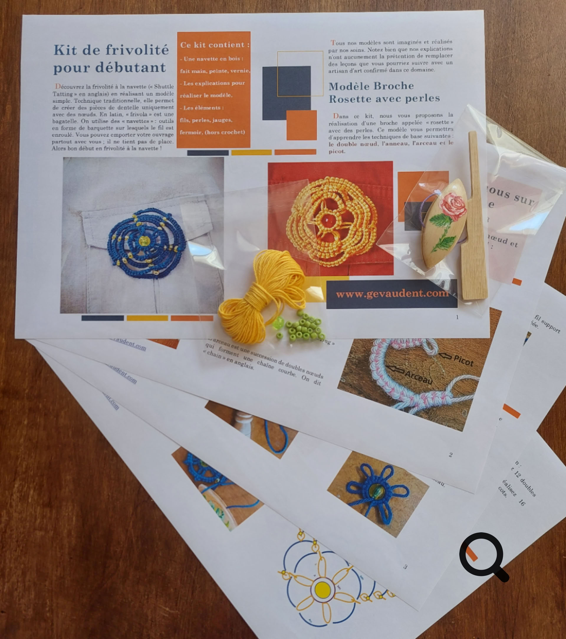 Dans ce kit, nous vous proposons la réalisation d’une broche appelée « rosette » avec des perles. Ce modèle vous permettra d’apprendre les techniques de base suivantes : le double nœud, l’anneau, l’arceau et le picot.