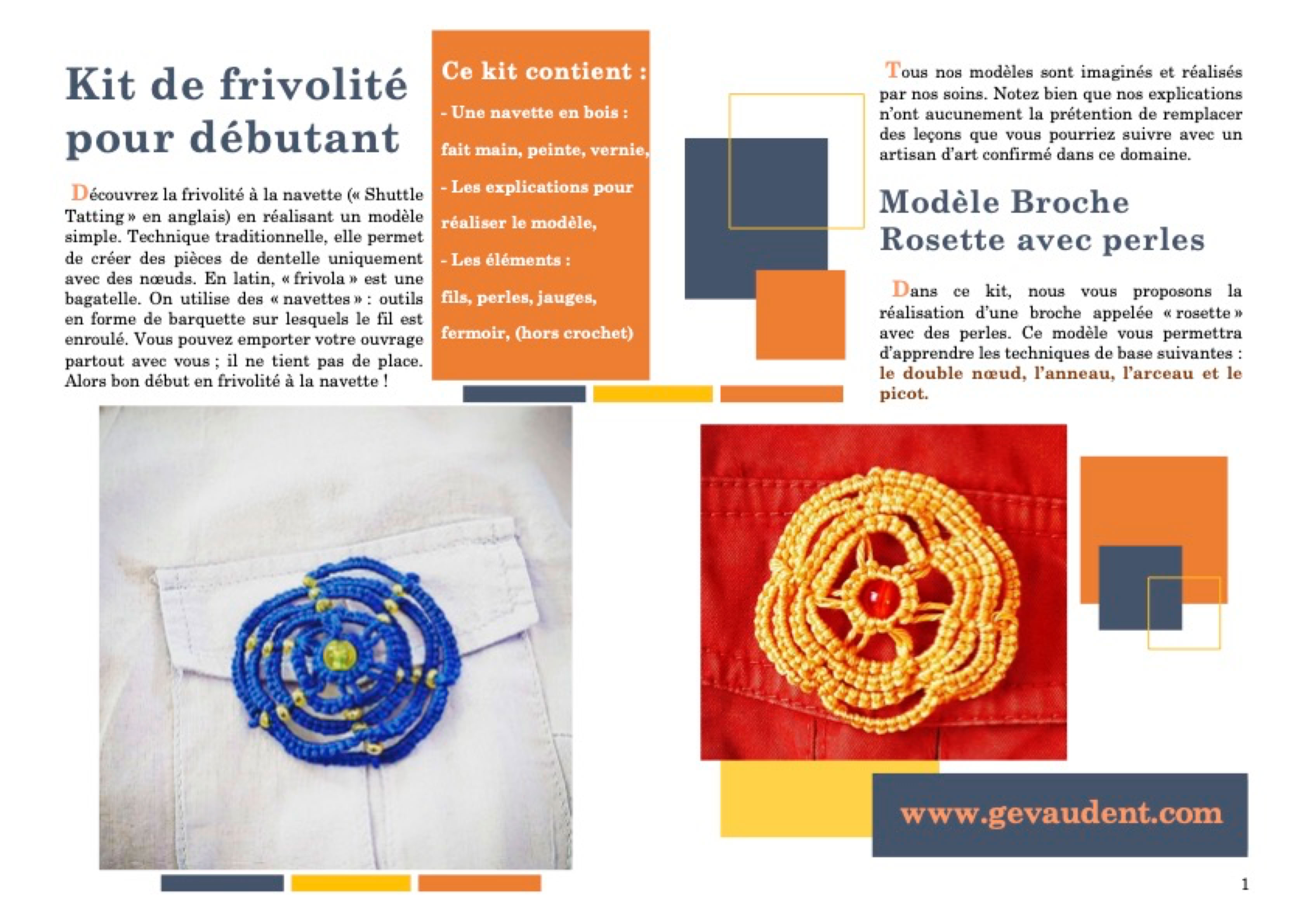 Dans ce kit, nous vous proposons la réalisation d’une broche appelée « rosette » avec des perles. Ce modèle vous permettra d’apprendre les techniques de base suivantes : le double nœud, l’anneau, l’arceau et le picot.